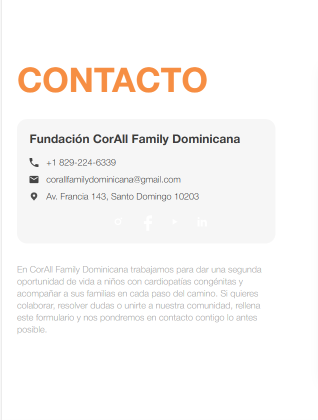 La Fundación CorAll Family Dominicana es una organización sin fines de lucro creada con el firme propósito de facilitar diagnósticos precisos, tratamientos médicos integrales y cirugías especializadas, priorizando a aquellos niños y niñas que se encuentran en situación de mayor vulnerabilidad.