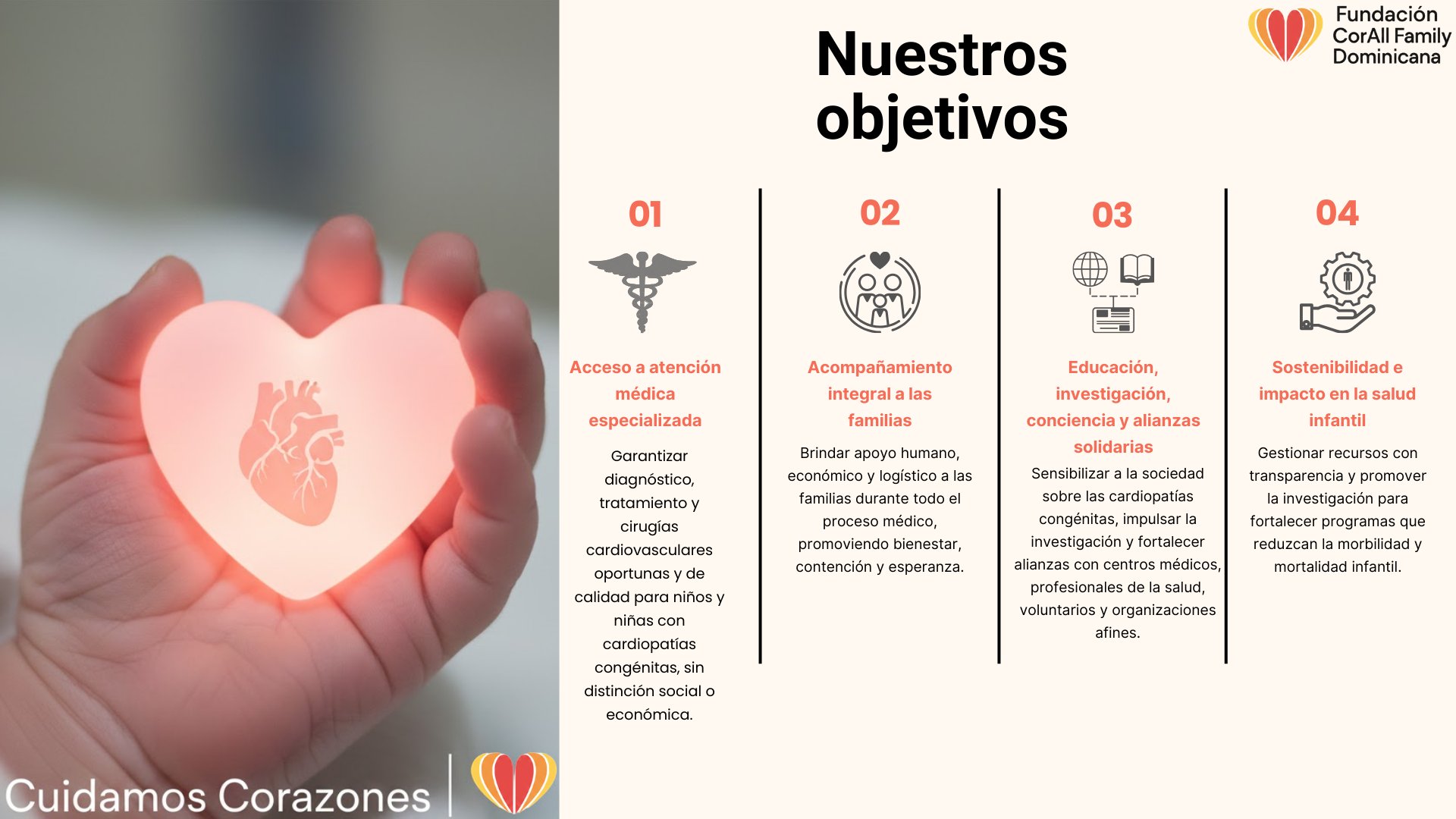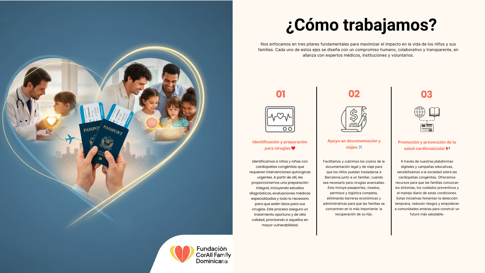 En la Fundación CorAll Family Dominicana, nuestros programas sociales se centran en brindar un apoyo integral a niños y niñas con cardiopatías congénitas en todo el mundo. Trabajamos para garantizar que cada pequeño reciba la atención médica especializada que necesita, independientemente de su situación económica o geográfica.